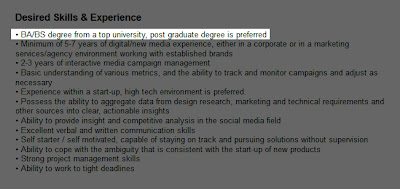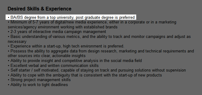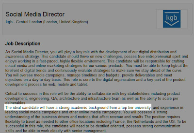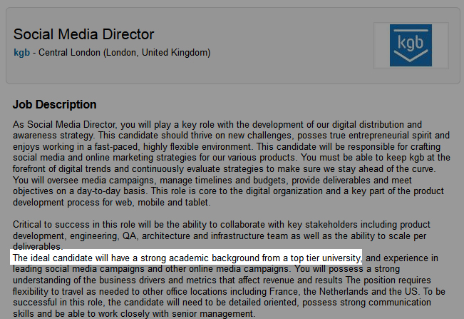 Whilst the job spec isn’t too bad the one key point which stuck out here was “The ideal candidate will have a strong academic background from a top tier university”.