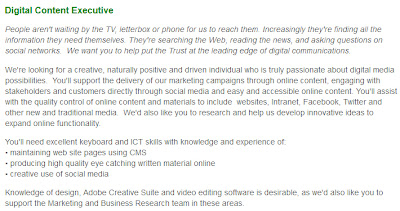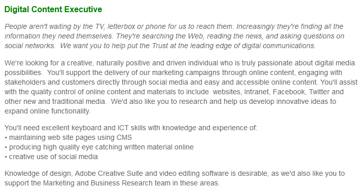 Digital Content Executive (what is that?) who is required to have “excellent keyboard and ICT skills”. Keyboard skills? Is this individual meant to be playing at birthday parties whilst churning out blog posts?