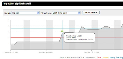 You can see my note (Green symbol) which is my note/reminder that this is when I attended the SMAEC event and since the event my ‘Impact’ has seen a sharp increase. The second peak is when I published my post-event blogpost titled ‘Is the Construction Industry ready for Social Media? No’. Again, my impact increased due to my blogpost. I can also check my web analytics tool to see if the traffic to my blog converted into subscriptions. We can clearly see the impact of a couple of tweets, a blog post over various metrics and measures.