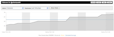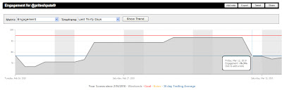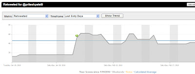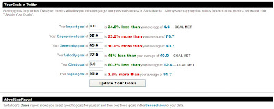 Twitalyzers definition of Velocity is an indication of the relative frequency at which a user publishes updates in Twitter. Remember the red line? This is my benchmark which I had set in the Goals section of Twitalyzer. Doing pretty well huh?