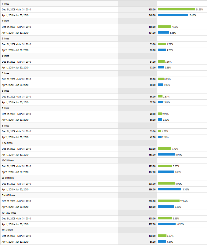The ‘Visitor Loyalty’ report (I love this report) above tells me that I have reduced the number of visitors returning to my site just the 1 time (reduced one night stands). Great! I also reduced the number of visitors returning twice, or 3 times.