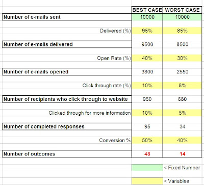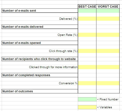 The below image shows you the framework template which I like to use to plan for a customer acquisition e-mail campaign which has columns for best case and worst case scenarios. The green boxes represent how many contacts you intend to target and will always be fixed for both best case and worst case scenarios and the yellow boxes are ‘variables’ and these can vary depending on the type of campaign discussed earlier. I use my own variables based on results from previous campaigns and it may take a few campaigns before you can define set percentages to use as benchmarks.