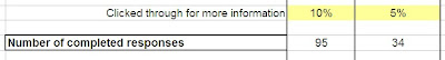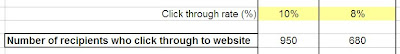 We now move onto those who find the e-mail of interest and will go on to click through to the website or landing page. Remember, your landing page needs to be relevant to what the e-mail has promised, if not then this is where it all breaks down. For this I have set the ‘open rate’ to 10% best case and 8% worst case so I get an idea of what would happen if my messaging was not quite right within the e-mail.
