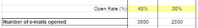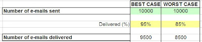 Ok, so we have 10,000 contacts and a best case scenario would be a delivery rate of 95%. It could be higher depending on how well the database was cleansed and the wording of your subject line. We also need to identify a worst case scenario which we can set as 85%.